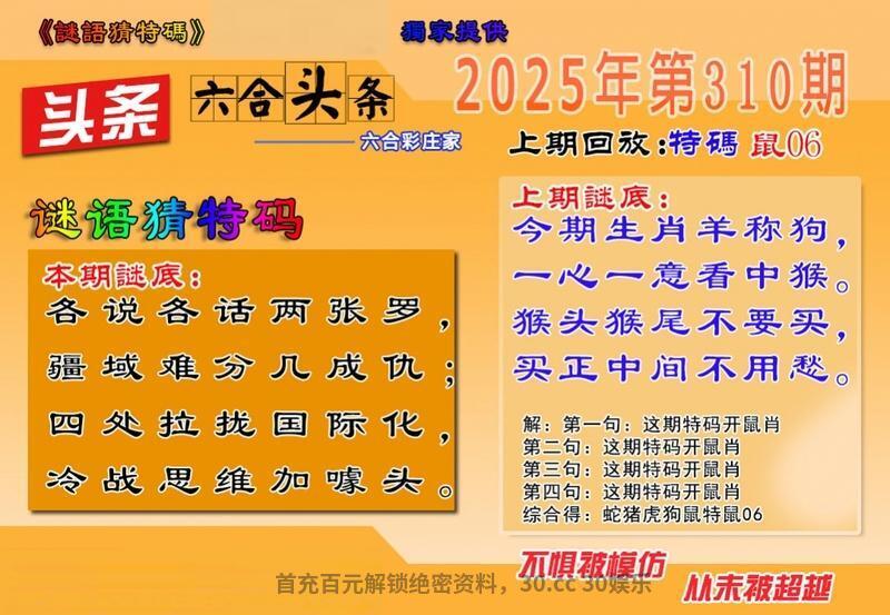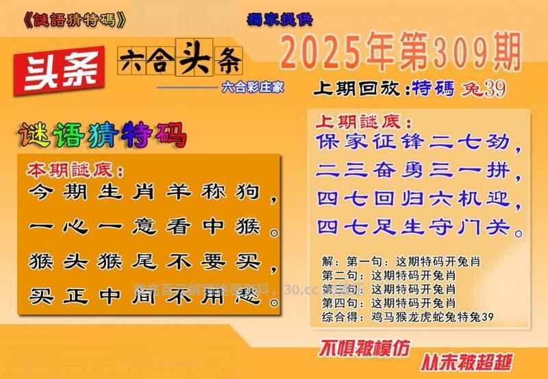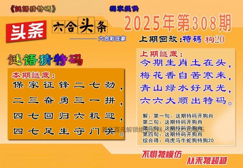 308期 保家征锋二七劲 二三奋勇三一拼 四七回归六机迎 四七足生守门关 解译:二三奋勇三一拼指23羊31猪,四七回归六机迎指47羊06鼠 九肖:羊猪鼠兔狗虎蛇猴龙 六肖:羊猪鼠兔狗虎 |