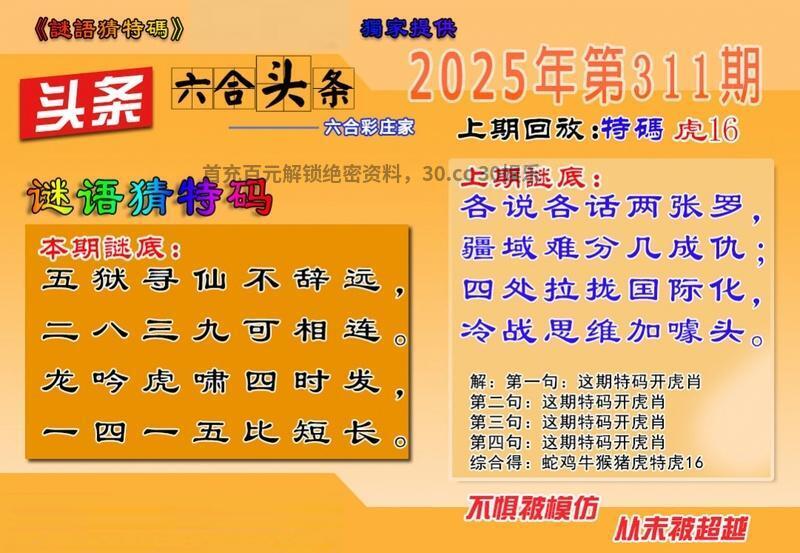 310期 各说各话两张罗 疆域难分几成仇 四处拉拢国际化 冷战思维加噱头 解译:四处拉拢国际化指04虎,冷战思维加噱头指战肖虎马狗牛 九肖:虎马狗牛龙蛇猪鼠兔 六肖:虎马狗牛龙蛇 三肖:虎马狗 一肖:虎 特码:16.28.24.36.20.32.17.29.14.26.13.25 |
